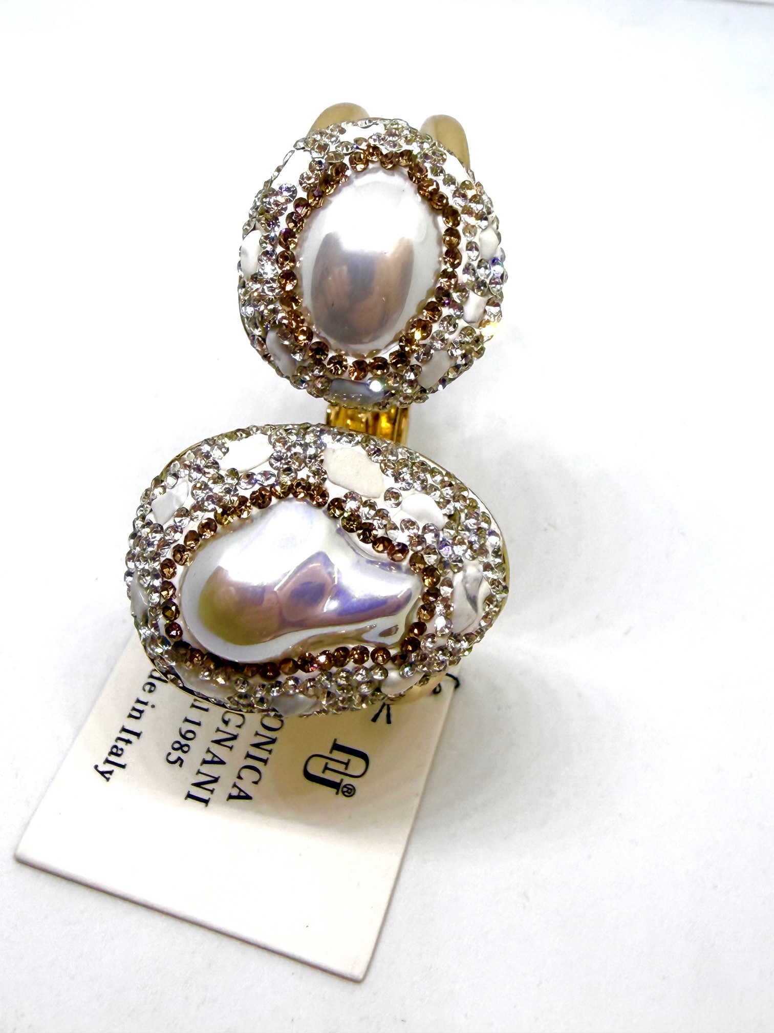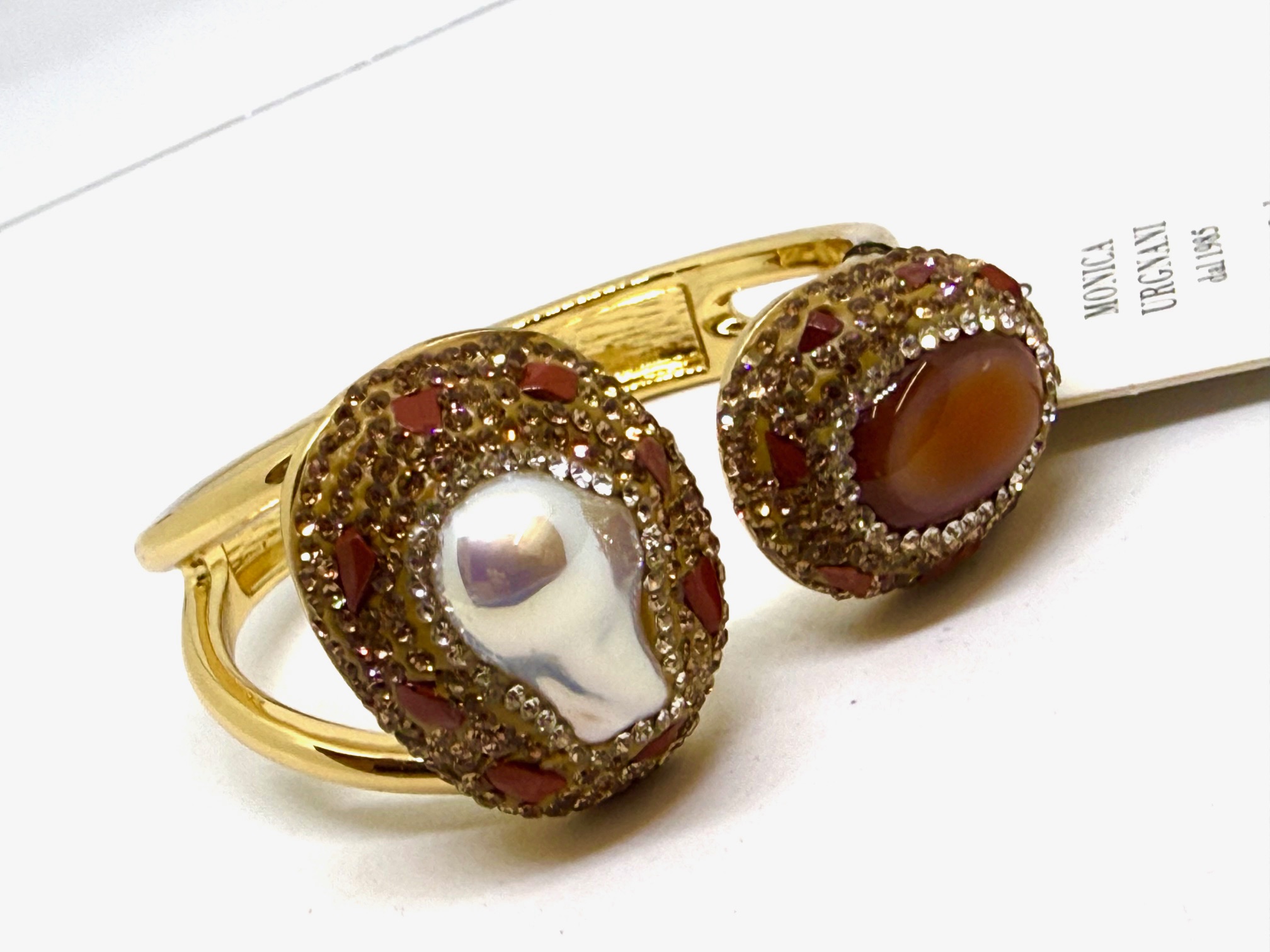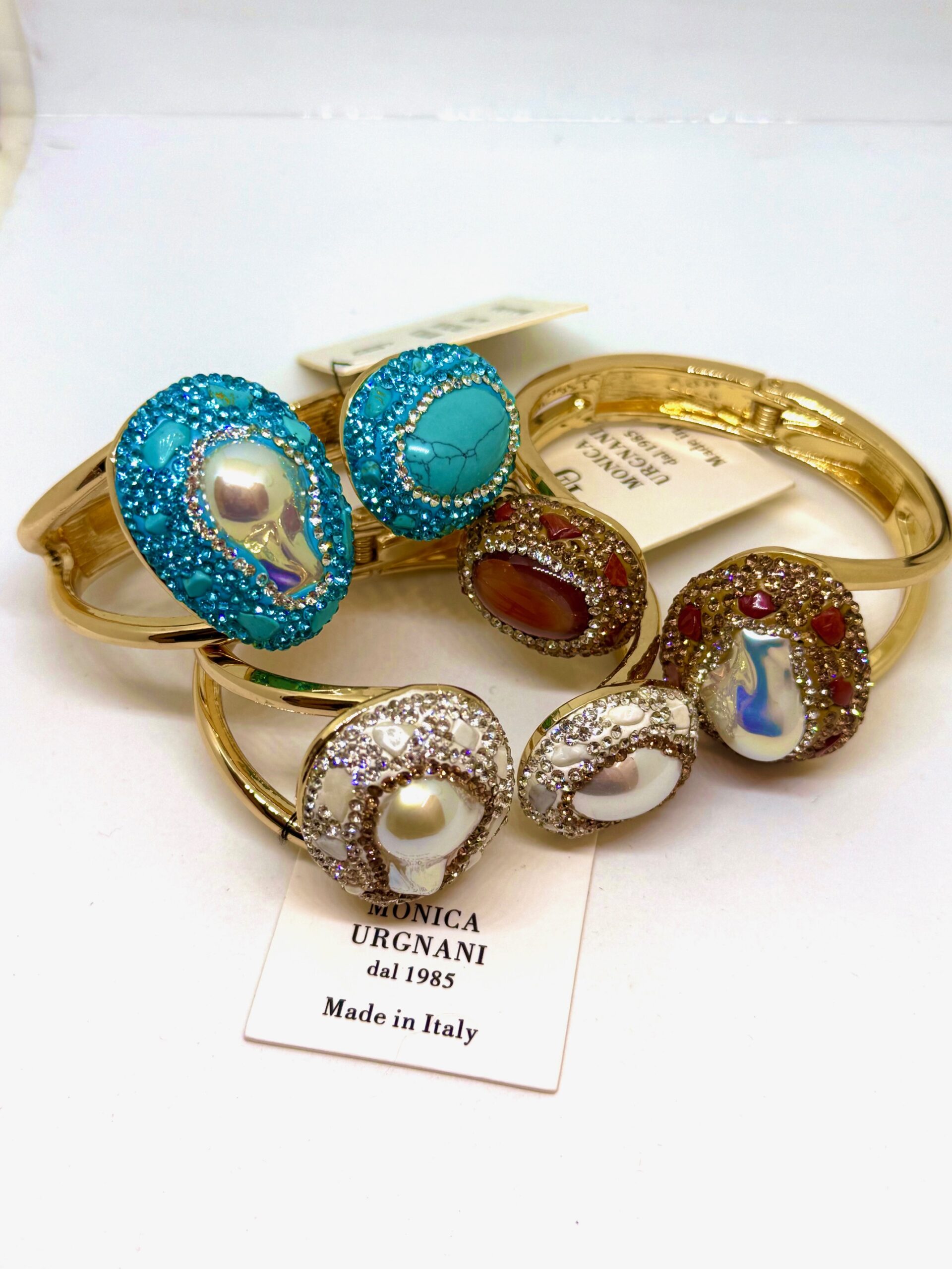 Bracciale con apertura a molla disponibile in tre colorazioni Turchese, Perla e Marrone, tempestato di strass.