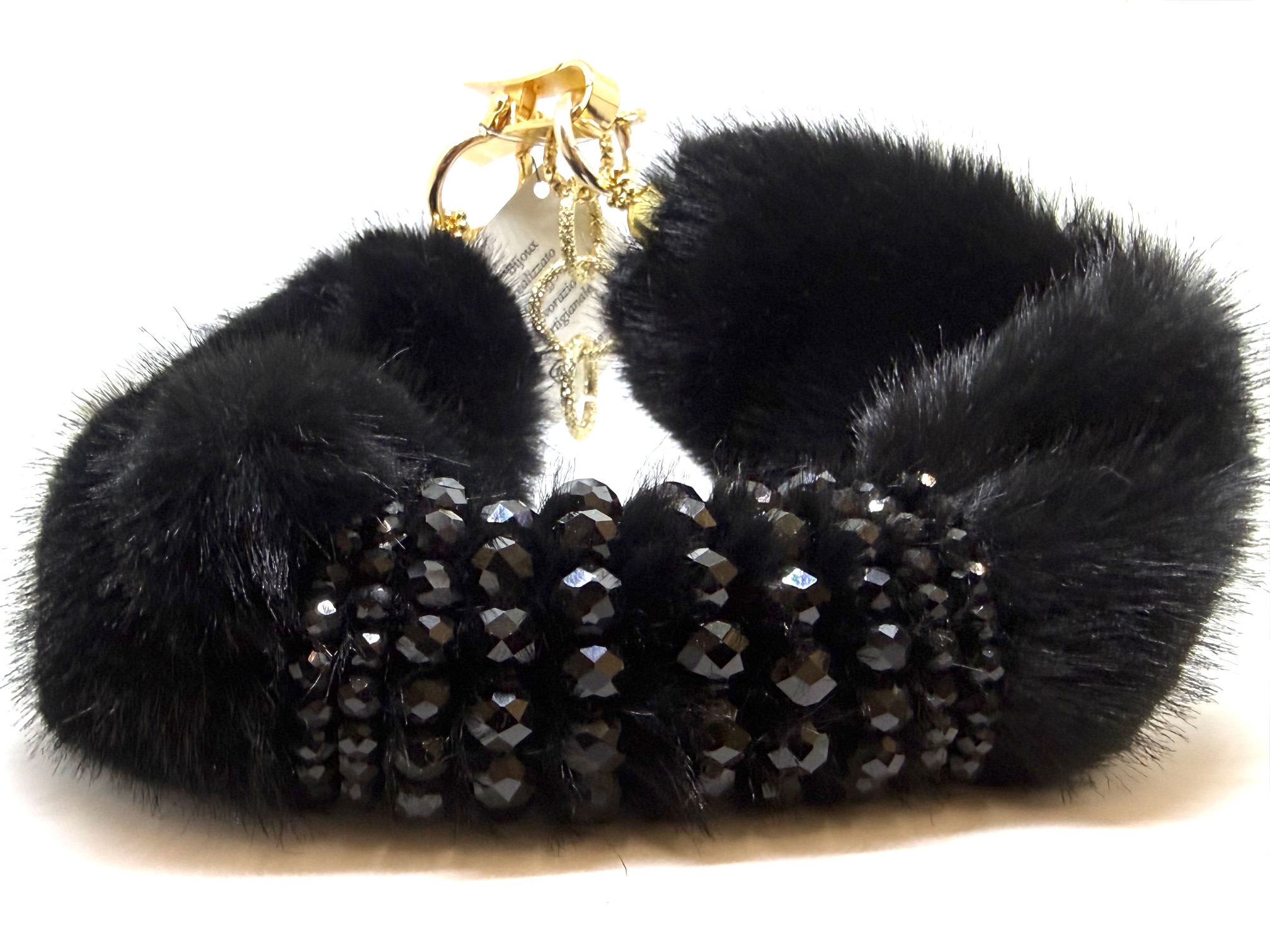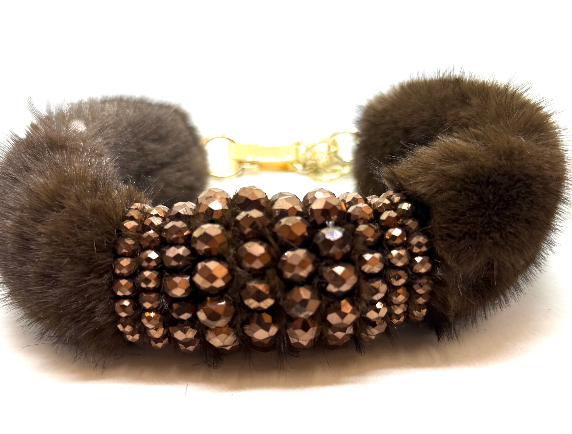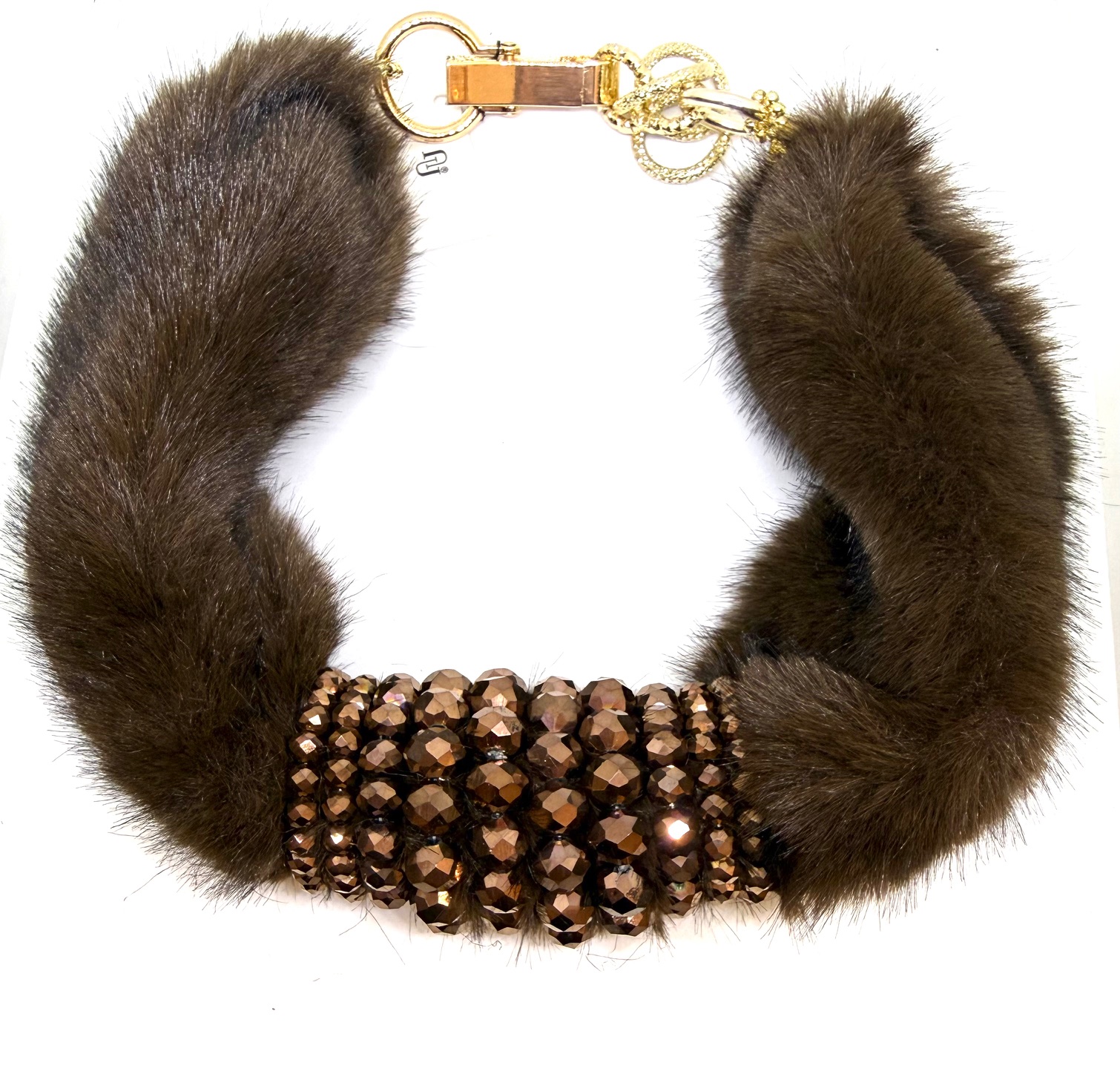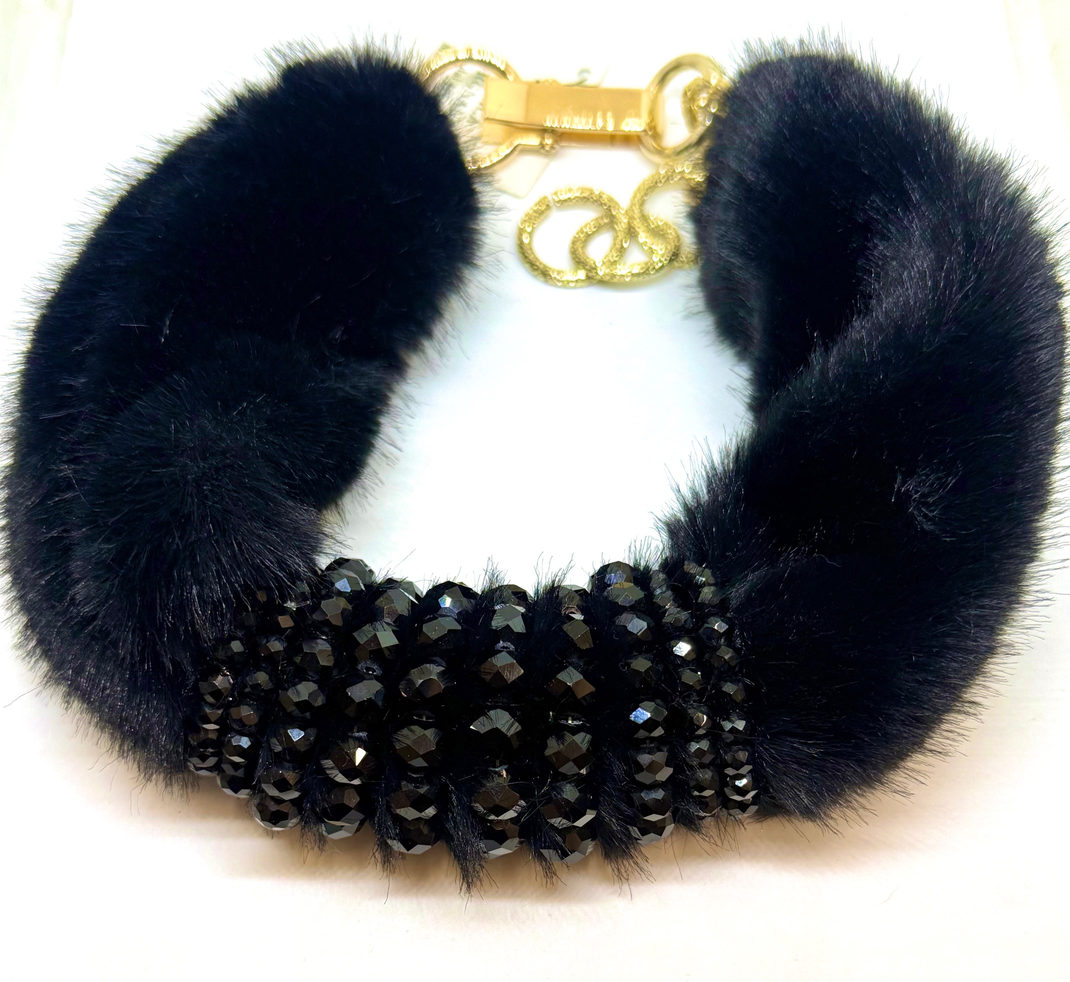 Collana girocollo in pelliccia sintetica, con particolari in cristallo, lunghezza moschettone regolabile.