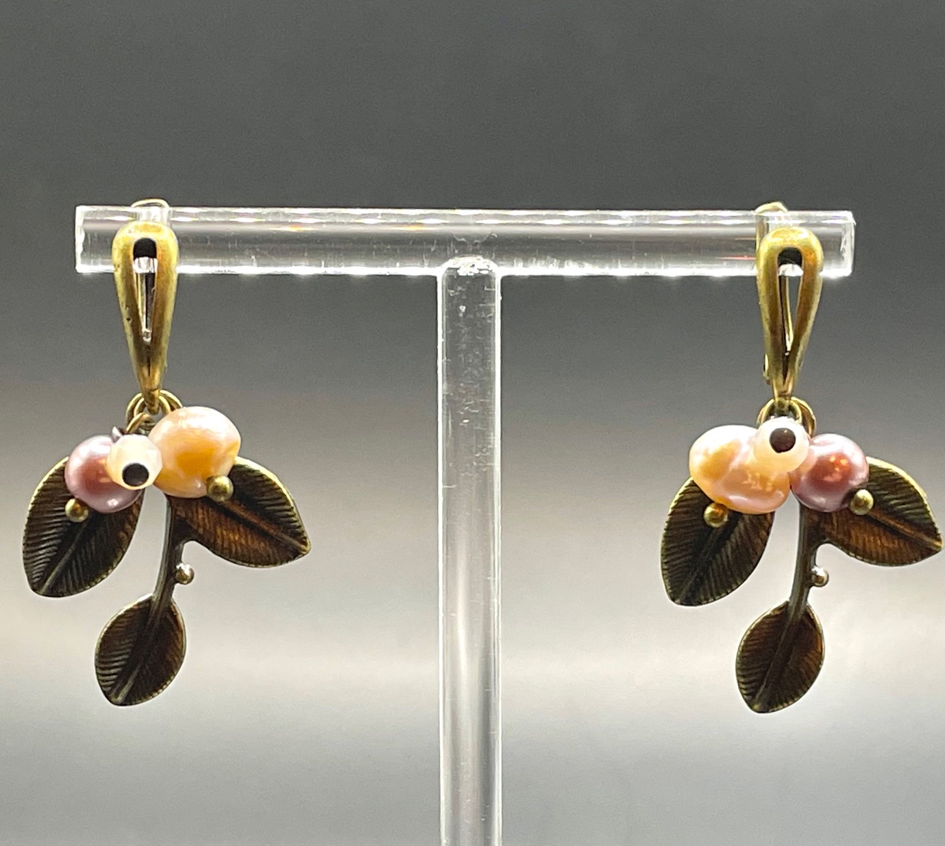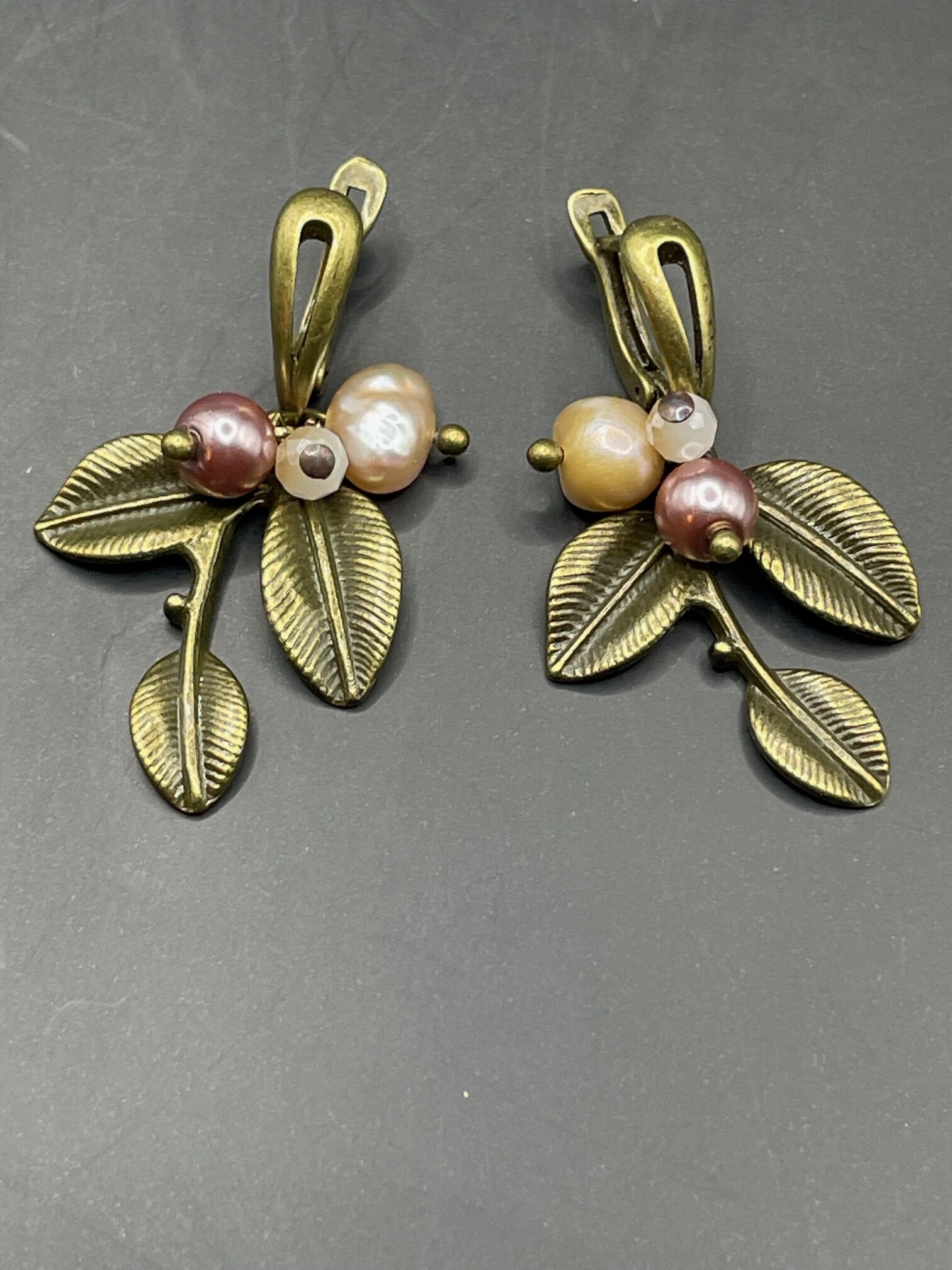 Orecchino vintage pendente con perla di fiume e cristallo, foglie effetto ottone, monachella uno scatto in ottone anticato.