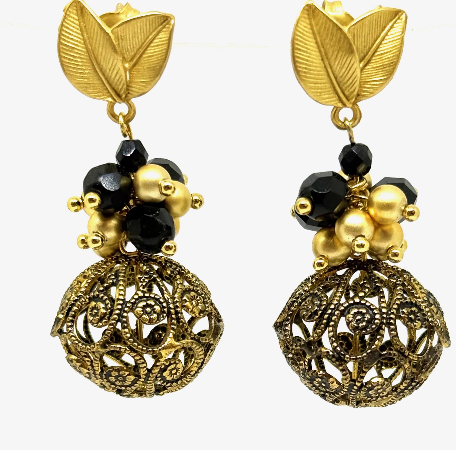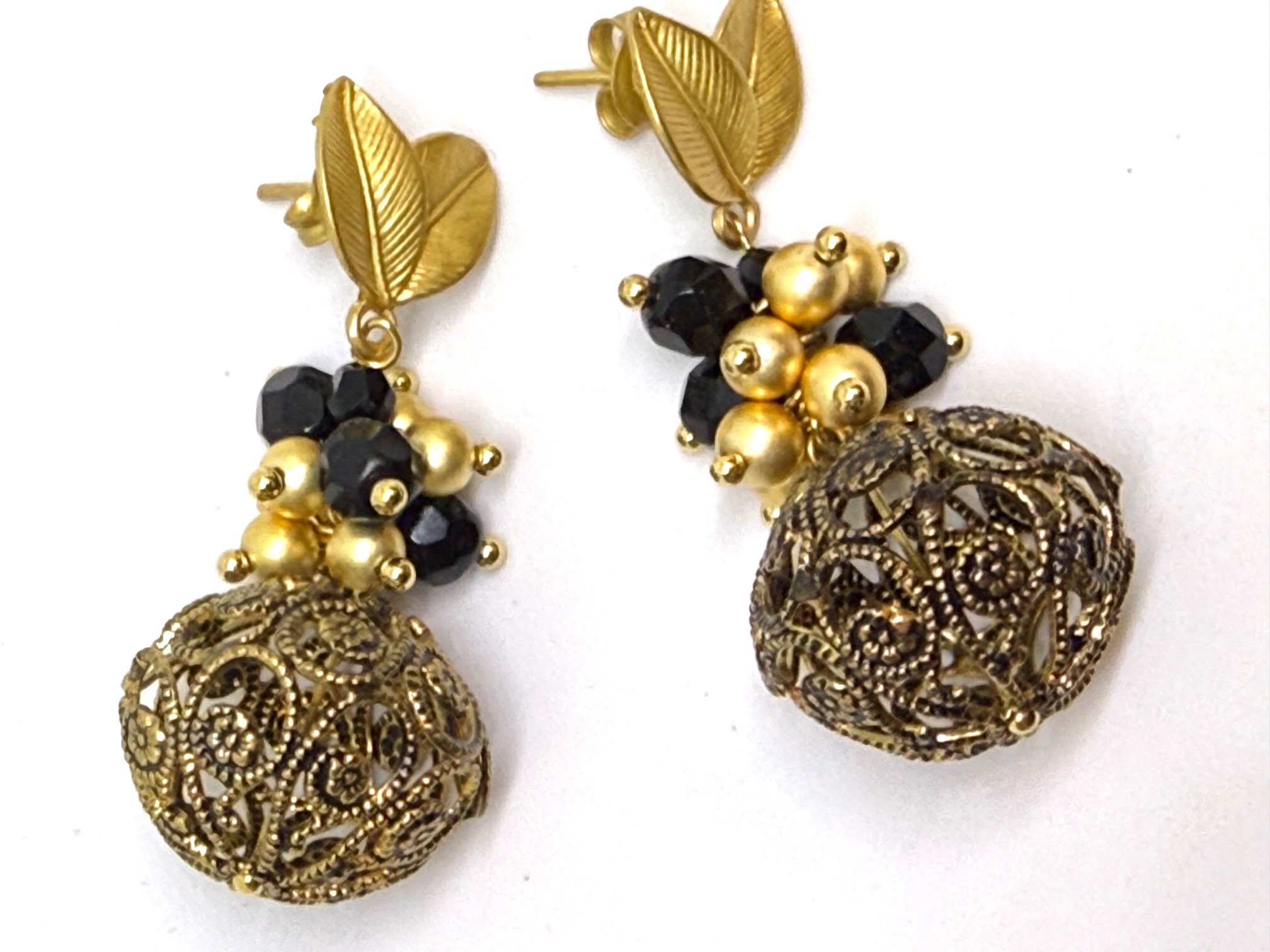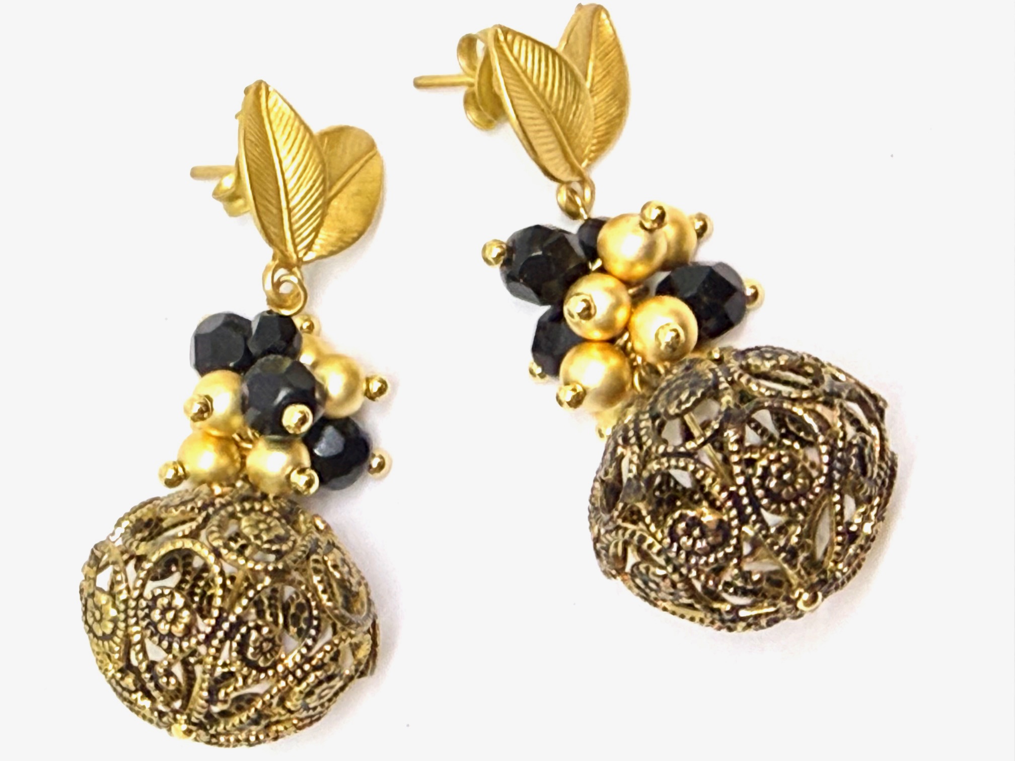 Orecchino vintage pendente con palla ricamata, cristalli neri e perle oro satinate di fiume e cristallo, monachella con foglie oro satinato.