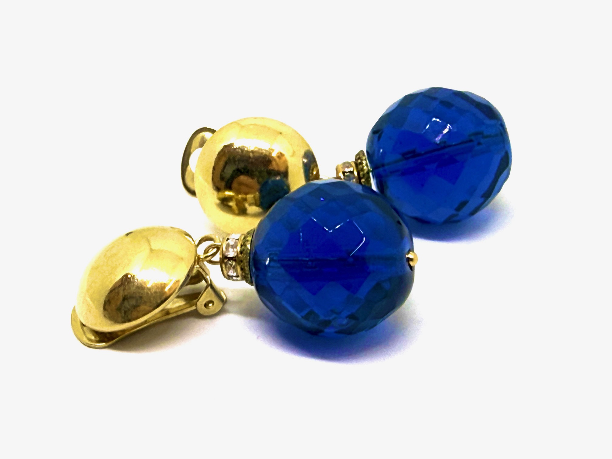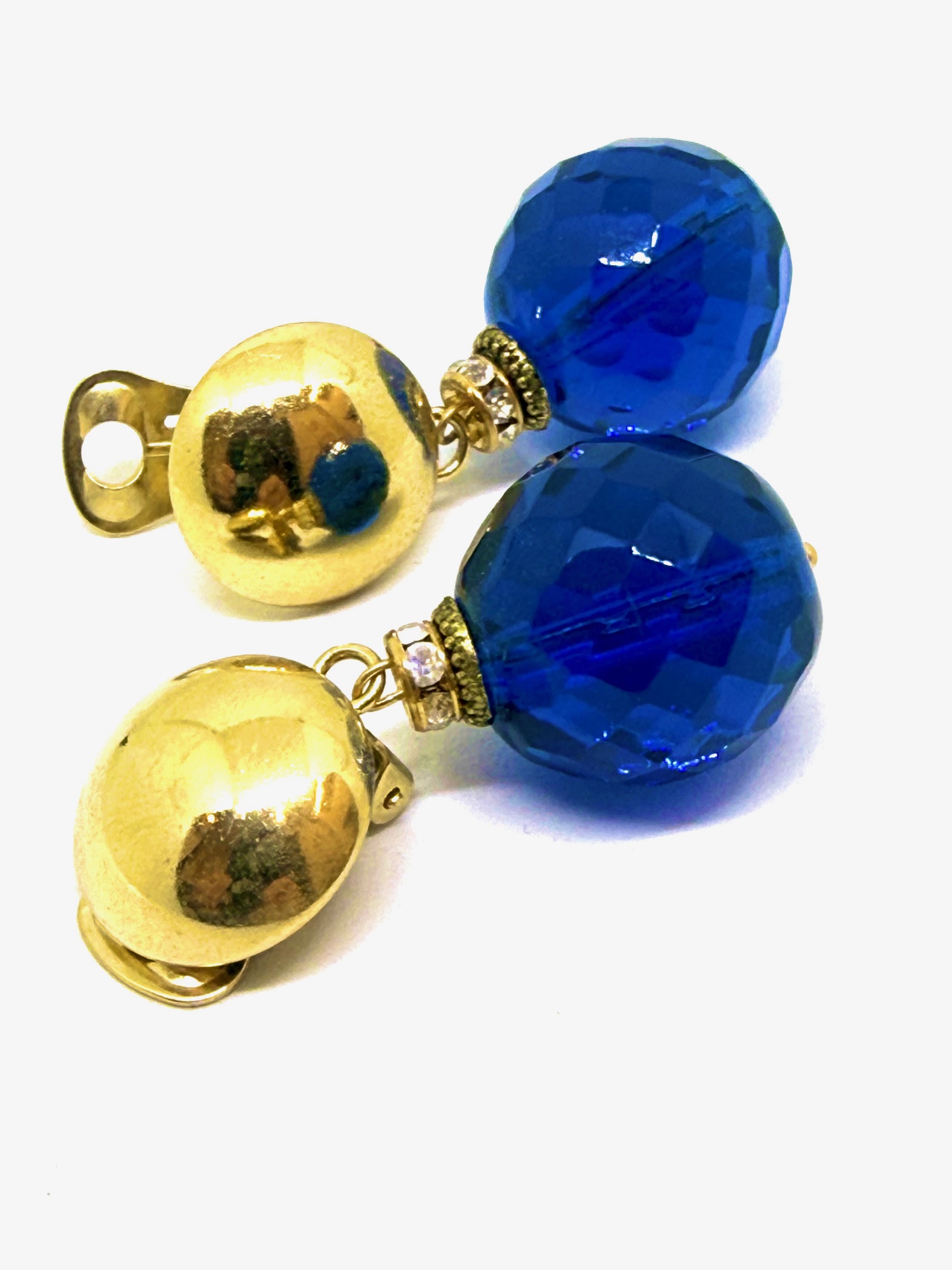 Orecchino in cristallo blu cina, con rondella dorata in strass, clip dorata.