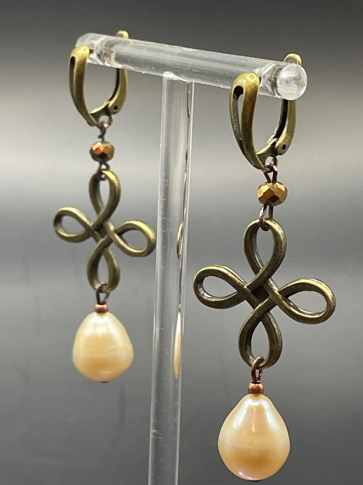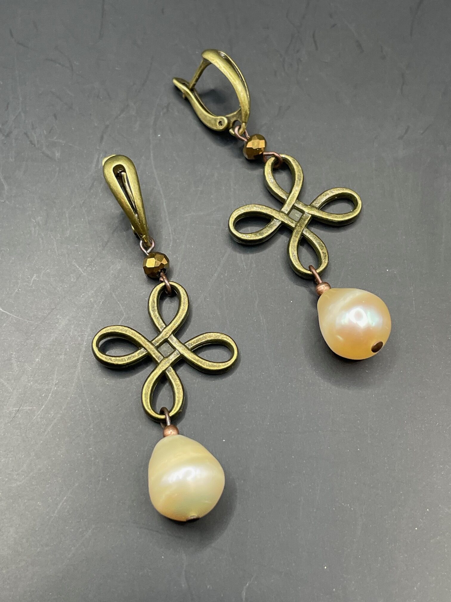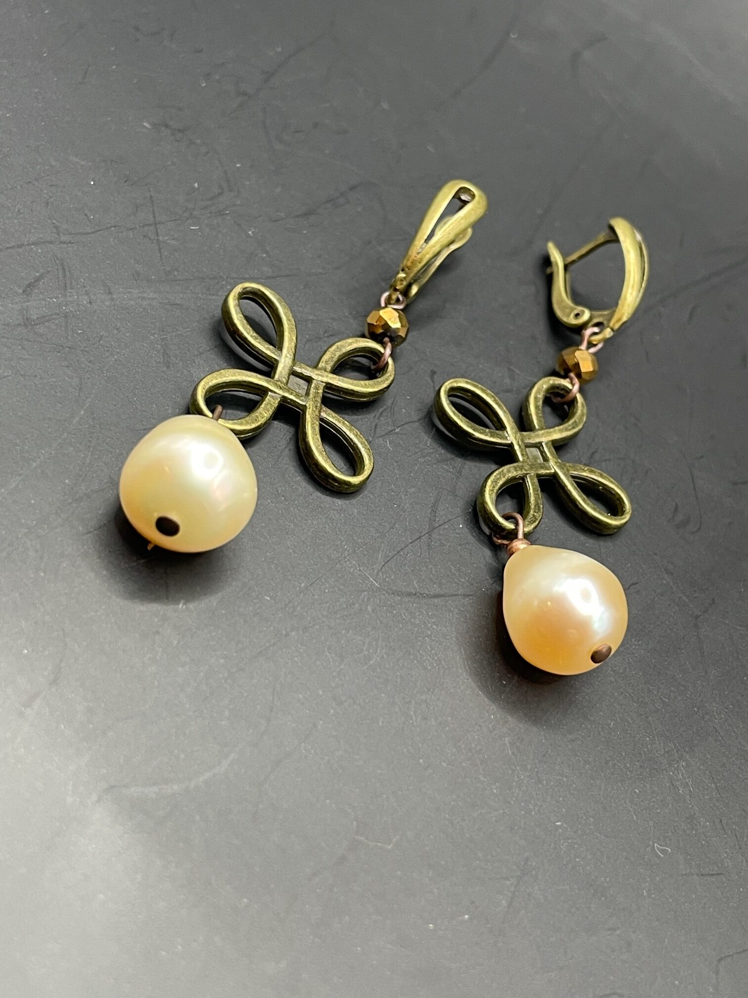 Orecchino vintage pendente con perla di fiume e cristallo bronzo, monachella uno scatto in ottone anticato.